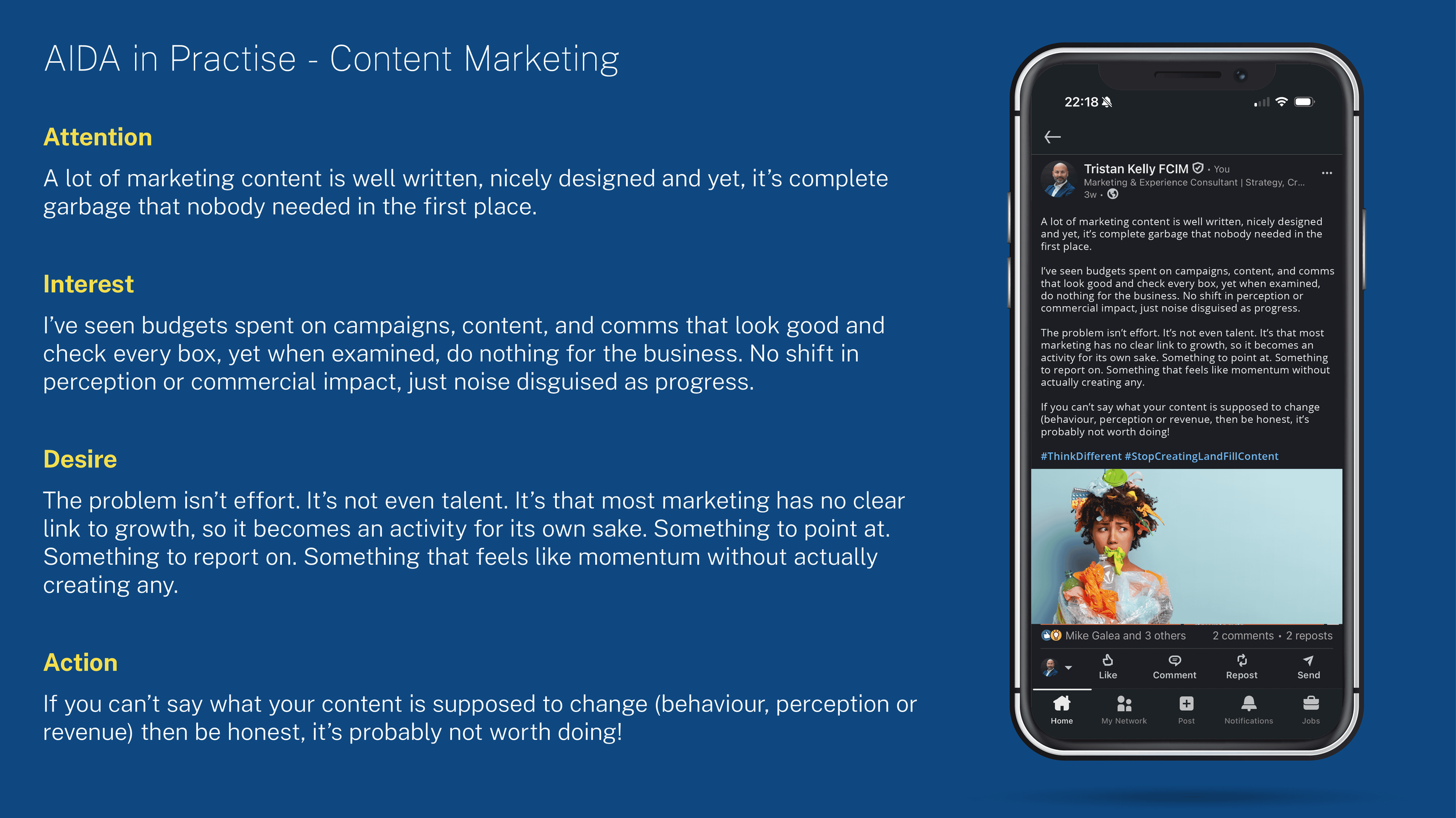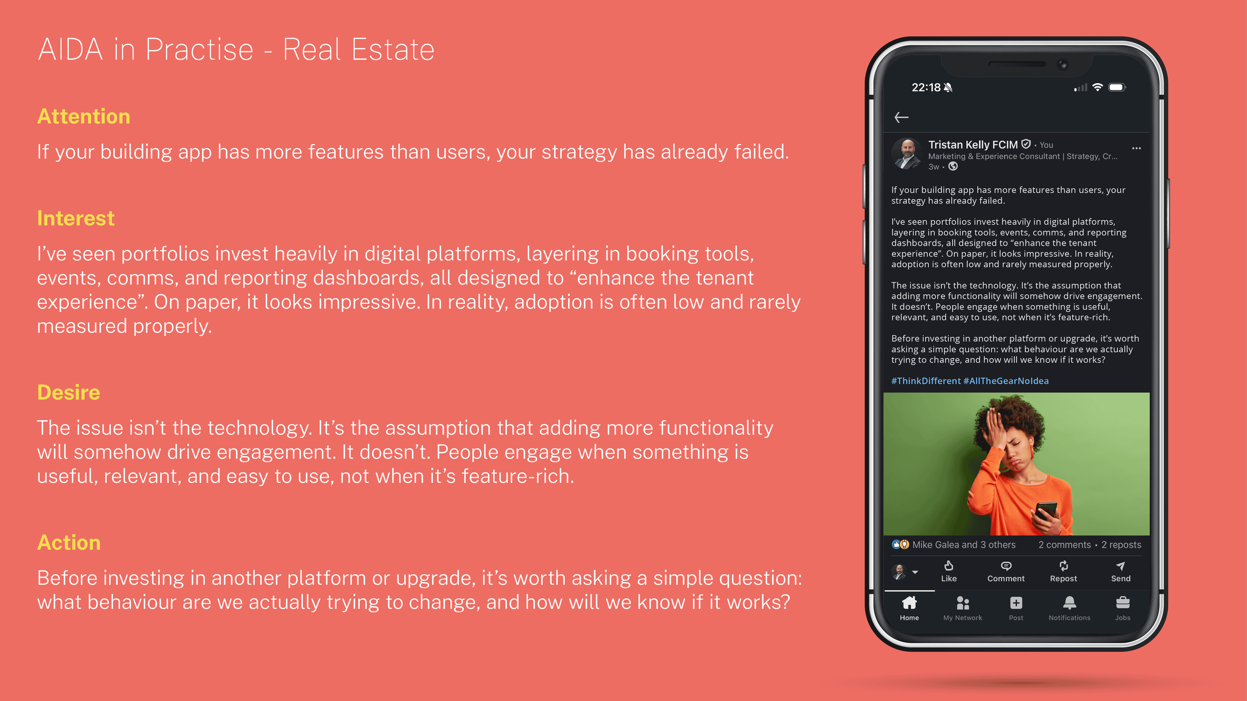 Attention comes from saying something that disrupts expectation, rather than trying to sound clever. Interest is built by expanding on a point the reader recognises as true from their own experience. Desire follows when that point becomes relevant to them, particularly regarding what they might be doing wrong or what they might be missing. Action, in this context, is less about a call to click and more about encouraging a shift in thinking.